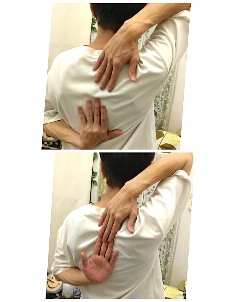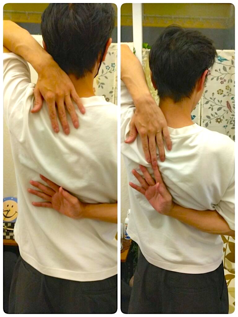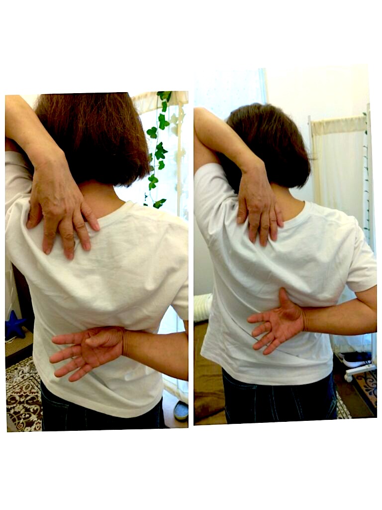 肩の可動域が狭く、背中で手が組めなかった方も、数回の施術でここまで改善。